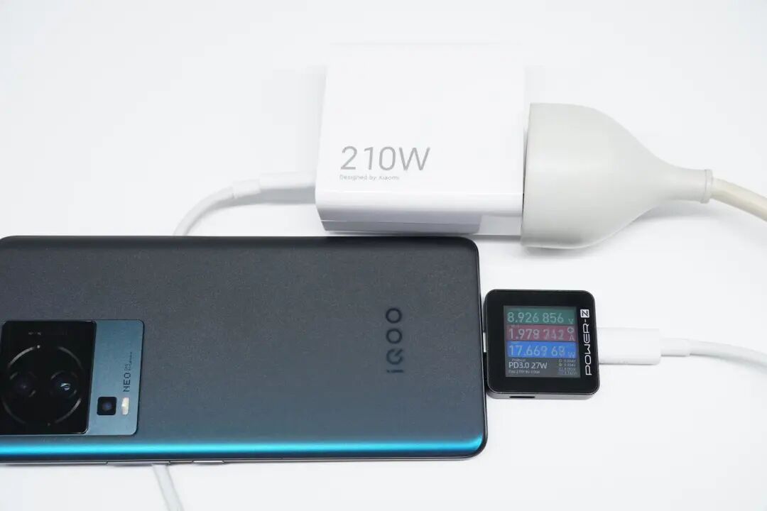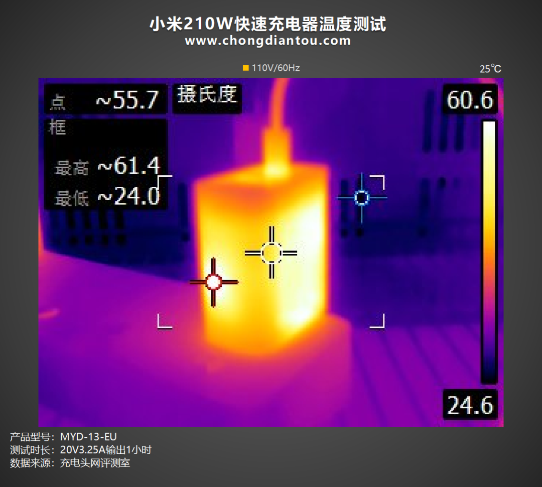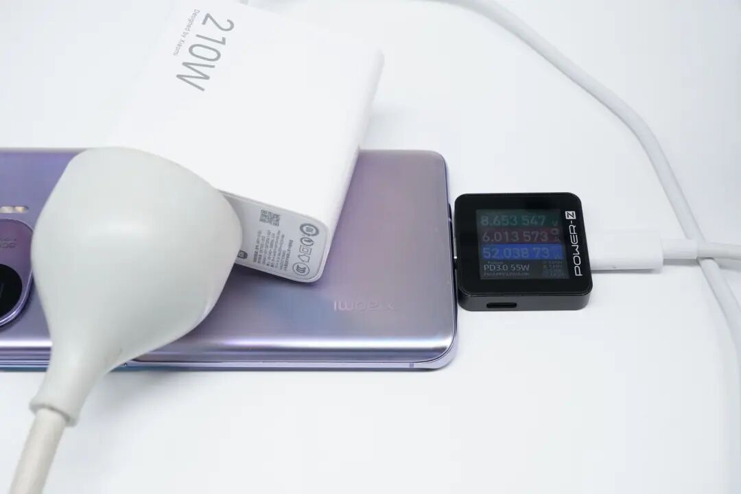 小米210W快速充电器的充电全程测试,此次选用了MacBook Pro M2 作为测试对象,记录充电器为MacBook Pro M2 充满电的所用时长,测试全程在25℃恒温箱中进行,接通电源,测试数据如下。接通电源,握手20V电压档位;6分钟前功率稳定在56W左右,随后功率逐渐下降;34分钟,功率稳定在37W左右并持续充电至第46分钟;1小时1分钟,功率稳定在25W左右持续充电约30分钟,随后进入涓流充电直至充电结束,充电全程耗时2小时33分。绘制成折线图可以看出,小米210W快速充电器一小时为MacBook Pro M2充电64%,两小时充电95%,完全充满则需要2小时33分左右。