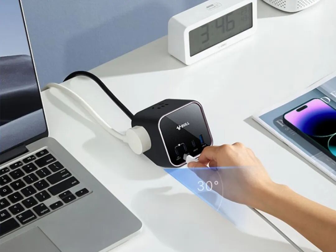公牛山峰快充插座看上去与“魔方插座”类型接近,但其底部切去了一个部分,让插座倾斜 30 度放置,这个小小的创意设计让插拔角度更合理,提升使用舒适性。