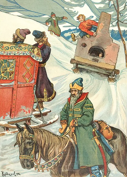 1913年俄罗斯民间故事《遵照梭子鱼的愿望》(也被称为《傻子埃米利安》)的插图