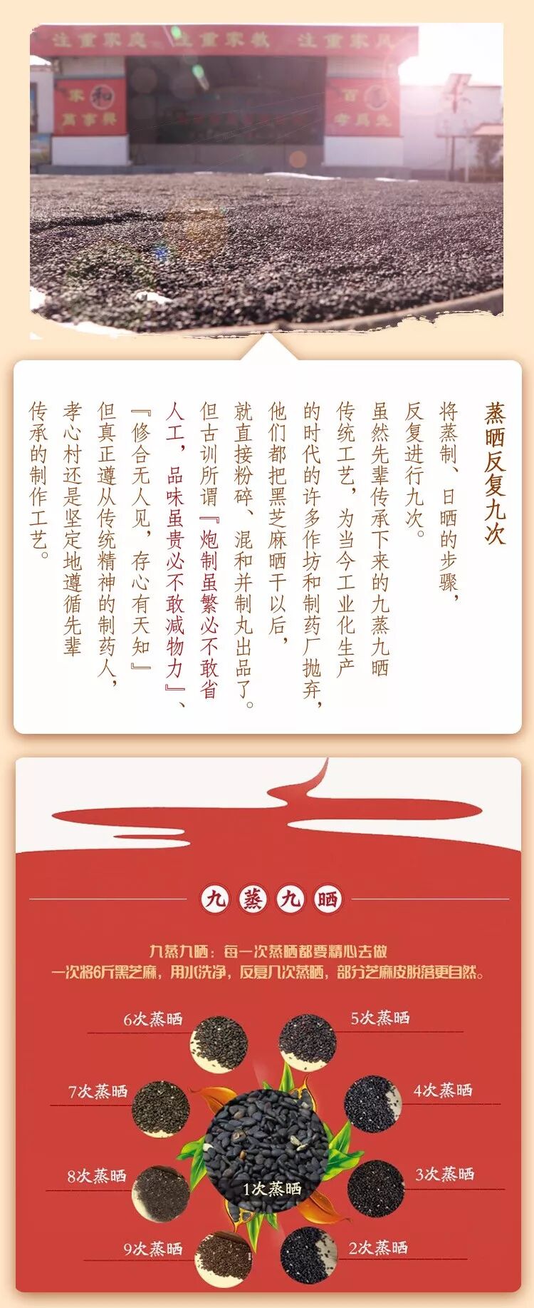 蒸晒反复九次,每天翻黑芝麻达6次之多,要让黑芝麻均匀的受热晒干。