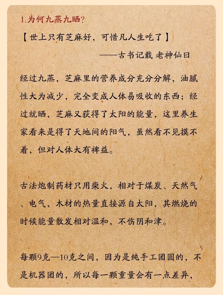 经过九蒸,芝麻里的营养成分充分分解,油腻性大为减少,完全变成人体易于吸收的东西;经过九晒,芝麻又获得了太阳的能量,这在养生家看来是天地间的阳气,虽然看不见摸不着,但对人体大有裨益。