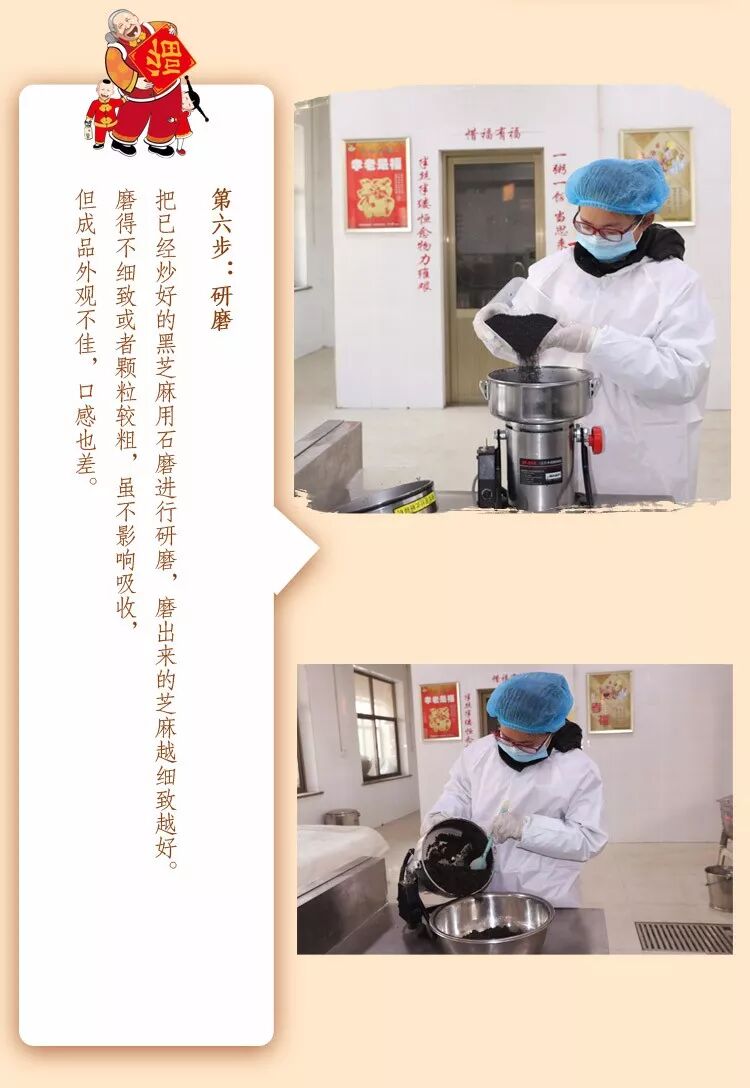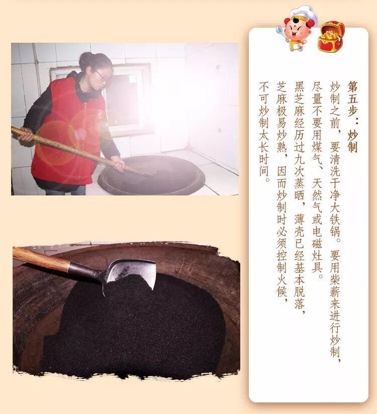 黑芝麻为五谷之首,在《神农本草经》中列为上品,一定要选用颗粒饱满的芝麻,选取无农药化肥除草剂种植的老品种黑芝麻,确保原料安全。