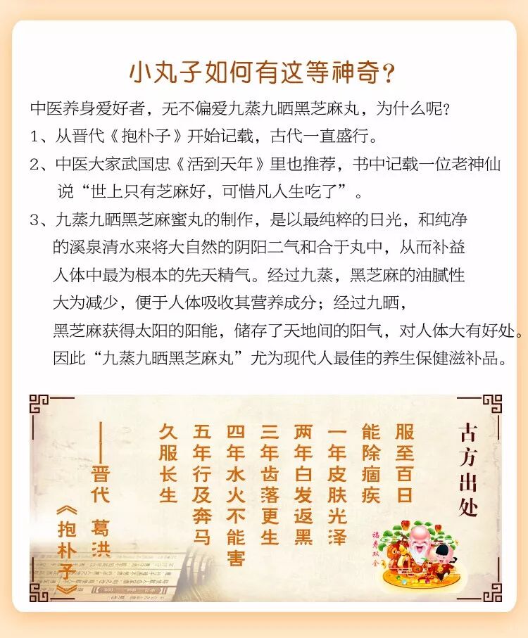 经过九蒸九晒之后,肠胃可以充分吸收了黑芝麻的自然黑色素、活发营养,然后一步步从内在调理头发黑色素分泌、滋养发根。