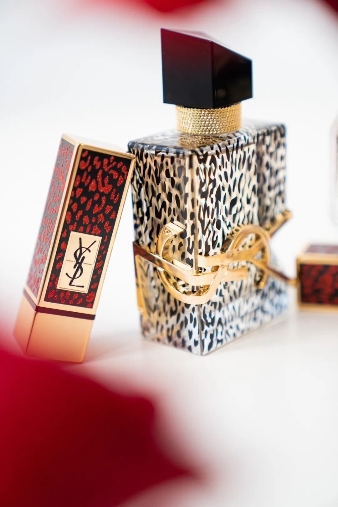 限定礼盒里的「自由之水」外观是豹纹花纹,致敬了1982年YSL秋冬服装高定系列中的豹纹元素,以及黑金搭配、立体轮廓线条,整个瓶身都具有时装感。因此配「方管#1」蓝调正红,是非常冶艳风情的选择。