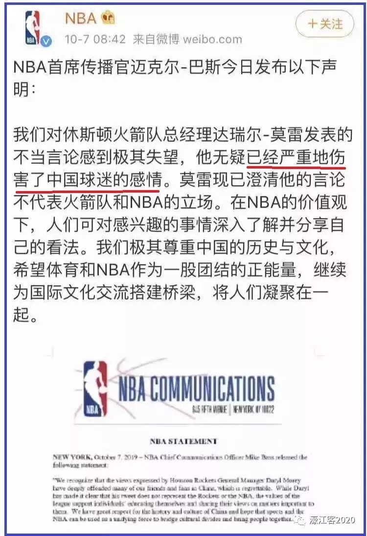 第二,为什么NBA官方要为莫雷个人的不当言论专门向中方发表一个声明?