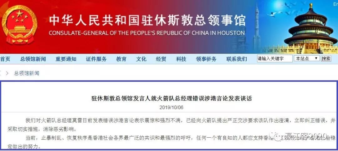 (一)我驻休斯敦总领馆要求NBA火箭队立即纠正错误