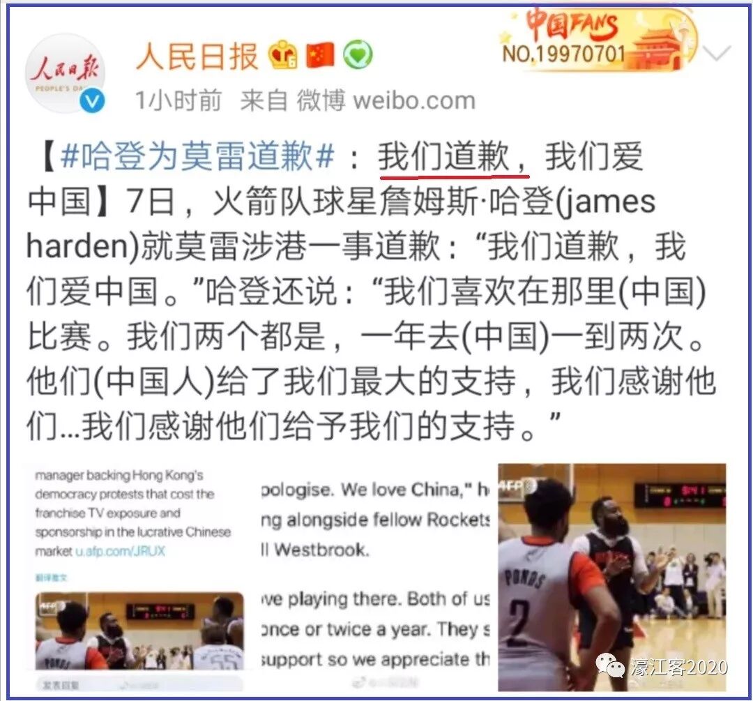 莫雷,你欠中国人民一个道歉,火箭队,你欠中国人民一个解释。