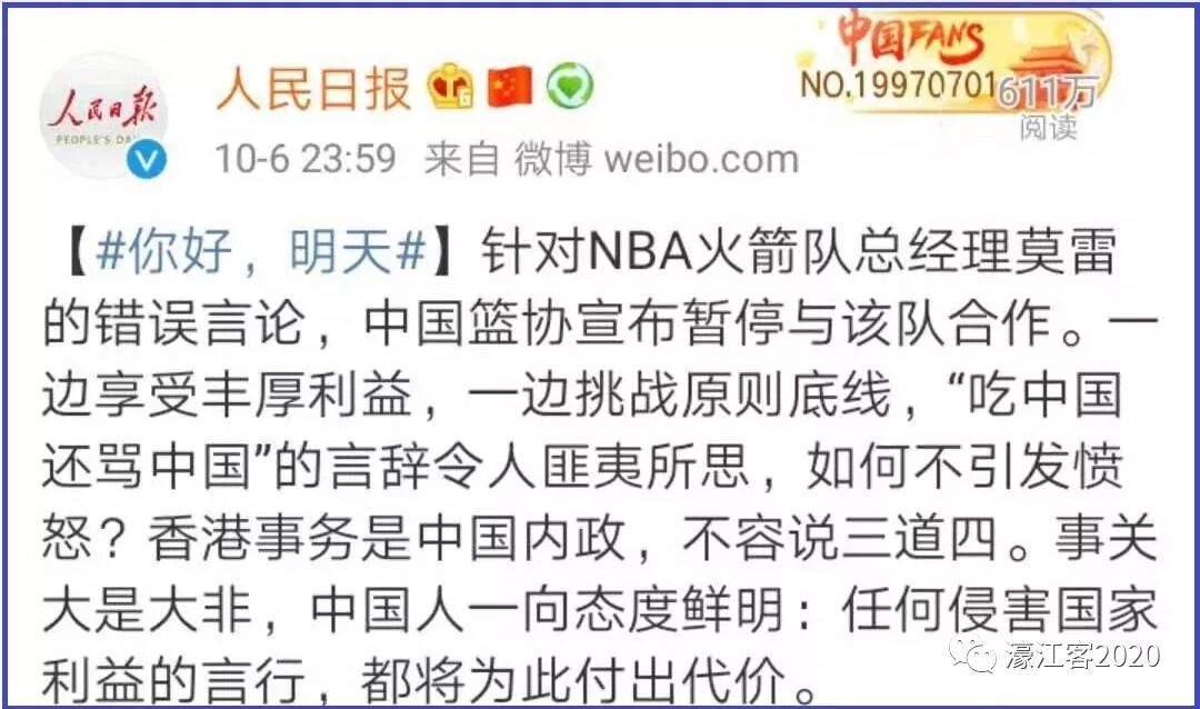 当然,以前很多次的被伤害感情事件,也都是别人告诉我的。7日上午,濠哥看到朋友圈有人分享一条微博,原来是NBA首席传播官迈克尔-巴斯通过NBA开设在微博的中文账号发布了一条声明如下:我们对休斯顿火箭队总经理达瑞尔-莫雷发表的不当言论感到极其失望,他无疑已经严重地伤害了中国球迷的感情。莫雷现已澄清他的言论不代表火箭队和NBA的立场。在NBA的价值观下,人们可对感兴趣的事情深入了解并分享自己的看法。我们极其尊重中国的历史与文化,希望体育和NBA作为一股团结的正能量,继续为国际文化交流搭建桥梁,将人们凝聚在一起。4、NBA官方极其尊重中国的历史与文化,希望体育和NBA作为中美团结的正能量5、NBA的价值观是:人们可对感兴趣的事情深入了解并分享自己的看法![]()
