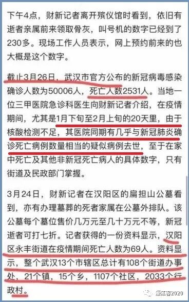 这一则报道还提到:“记者获得的一份资料显示,汉阳区永丰街道在疫情期间死亡人数为69人。资料显示,整个武汉13个市辖区总计有108个街道办事处,21个镇,15个乡,1107个社区,2033个行政村。”![]()