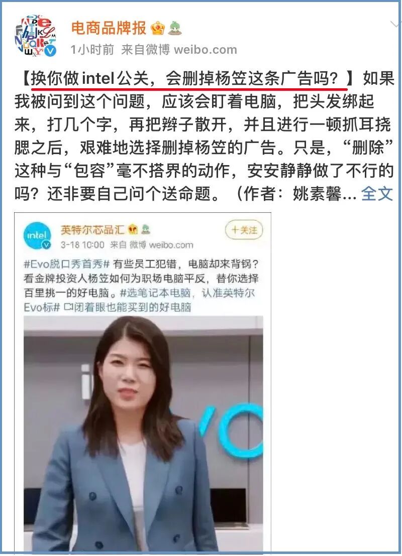 近期与吐槽大会有关的,还有一出。即女演员杨笠代言的英特尔产品广告被下线事件。据新京报标签为《杨笠英特尔代言遭下架》的报道,3月18日,脱口秀演员杨笠为英特尔笔记本进行商业宣传,引发争议。因杨笠此前关于男性的评价言论,不少网友对英特尔产品进行抵制。目前,英特尔撤下了与杨笠相关的宣传海报。2020年,杨笠参加《脱口秀大会》时,因“男人那么普通却那么自信”出圈。有网友以“涉嫌性别歧视”为由,向国家广播电视总局进行举报。但也有网友表示,杨笠不存在侮辱男性,只是脱口秀而已。![]()