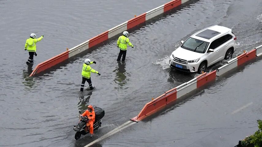 8月22日,郑州交警在市金水路下穿京广铁路隧道附近引导车辆绕行