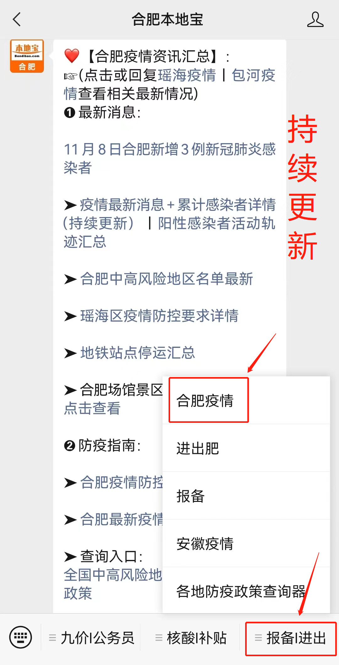 肖肖提示:点击下方公众号名片,关注合肥本地宝,关注后点击菜单栏【报备/进出】,选择【合肥疫情】即可获取合肥病例数据、活动轨迹等最新消息。