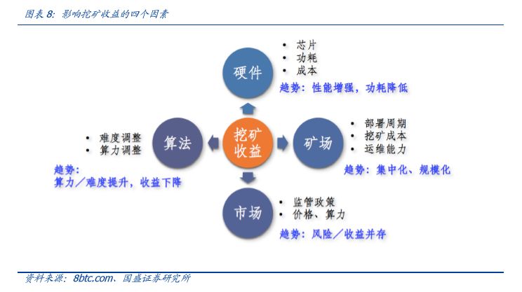 我们认为,从实用角度而言,矿机作为比特币系统中的关键组成部分,通过消耗计算和电力资源争夺记账权,为该系统增加了“信任价值”;从投资角度而言,比特币矿机可以视为比特币价格的“看涨期权”,正是因为矿工对未来币价持看涨态度,预期未来的挖矿收益会增加,从而加大了矿机的需求。后文我们还通过数据分析建模,对矿机的定价机制、矿工购买矿机的需求进行了深入分析。