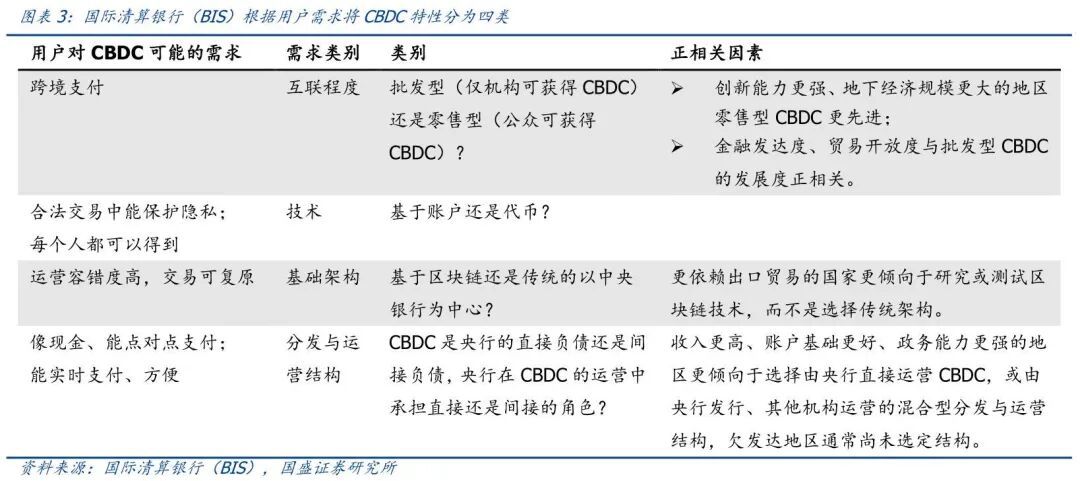 国际清算银行(BIS)根据用户对法币的需求将CBDC的特性分为四类: