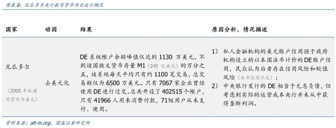 CBDC鲜少落地案例,几乎没有成功案例。与各国对CBDC研发的热情不同,实践中,CBDC落地状态堪忧。较为知名的落地案例几乎只有厄瓜多尔一例,而其因政府信用不足,已于2018年结束运行,运行时间不到3年。十余个国家正在开展CBDC试点/测试,其中,中国、东加勒比海、巴哈马、瑞典、柬埔寨、乌拉圭、韩国等国正在试点零售型。