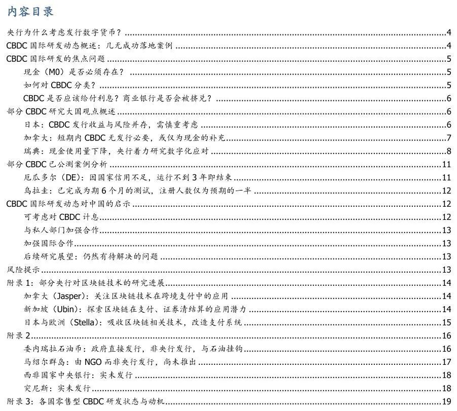 CBDC国际研发焦点问题有哪些?有无共识?对中国有何启示?焦点问题包括:1)既然使用率在下降,央行负债(M0)是否必须存在?2)是否应对CBDC计息?商业银行会否被挤兑?目前共识是现金不应该消失,以满足停电、无银行账户等特殊情境中民众的需求,另外,对CBDC计息不失为一种选项,以增加对公众的吸引力,并减少对商业银行的压力。后续有待深入研究的话题包括:平衡“用户隐私需求”与“完成央行反洗钱目标”、解决“不满足特定受理条件无法完成CBDC的支付”与“CBDC的法偿性”之间的矛盾、CBDC如果必须依靠银行提供,是否有损于金融普惠?无银行网点地区、无智能手机居民如何使用CBDC?商户端如何收费?市场化能实现到何种程度?