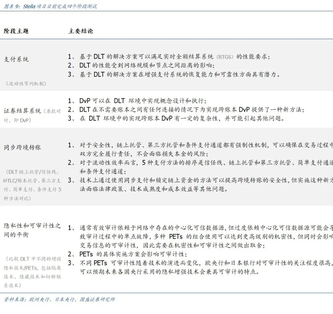 Stella目前已经完成四个阶段的研究和相关测试工作,包括:支付系统(流动性节约机制)、证券结算系统、同步跨境转账、平衡隐私性和可审计性。Stella 作为一个联合试验项目,目前并不能替代现有系统,官方发布的研究报告中也多次强调 DLT 的实际应用需要技术和成本方面进一步优化,以及会在当前的法律、监管政策框架下引起其他问题。目前,虽然欧洲和日本央行并没有明确宣布发行CBDC的计划,Stella 项目已经积累了大量具备实践价值的研究成果。