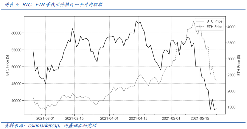 比特币、以太坊等主流加密货币在过去的一个多月内几乎全部腰斩。从去中心化市场的价值之锚——比特币的历史价格中我们可以看到,自去年三月,比特币的市场价格便一路上涨,从 2020 年3月的3600美元一直增长至 2021 年 4 月的最高点,超过64000美元。与之同时增长的还有整个 DeFi 生态,根据我们的以太坊指数,以太坊生态自 2020 年 6 月翻了近 8 倍,这一期间也被称之为 “DeFi 之春”。然而,当我们把时间线聚焦到最近一个月,比特币等几乎绝大部分加密货币价格出现了快速下跌的极端的行情,比特币从一个月内的最高点64899美元腰斩,最低跌至30000美元(coinbase价格),实际跌幅超过53%,其中5月10日至5月20日的跌幅即达50%。更进一步,从5月下旬以来,币价短期出现断崖式的下跌,幅度最大的一次在两小时内跌去了 5000 美元,接近 13% 的跌幅。而通常其他币种的跌幅都超过比特币。