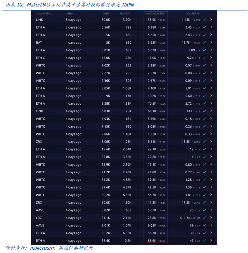 从更微观的层面,MakerDAO平台在清算过程中的偿付率均是100%,即抵押品足够支付借款和罚金。以以太坊生态最重要的借贷平台MakerDAO为例,在5月12日至5月24日,其主要抵押资产ETH价格跌幅超过60%(4384美元跌至1728美元,其他币种跌幅甚至更大),但期间的集中清算并未出现系统坏账,偿付率是100%。这样高的偿付率主要得益于DeFi生态中的超额抵押机制。以借贷平台Compound为例,用户通过超额抵押ETH获得 Dai的贷款。如果在贷款期间 ETH的价格大幅下跌,使得用户的抵押率低于平台对于ETH 要求的抵押率 133%,如果没有补足抵押品就会触发清算机制,并且还需要缴纳罚金。也就是说,超额抵押机制确保了DeFi生态中不易出现坏账。