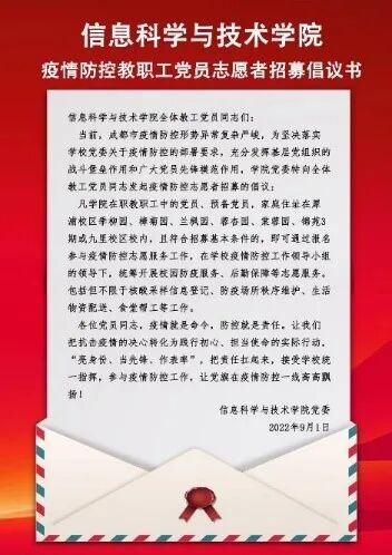 学院党委及时响应,向学院全体党员师生发出号召,向党员同志发出倡议“亮身份、当先锋、做表率”,把责任扛起来,参与到九里校区和犀浦校区的学生工作志愿服务中,让学生感受到老师的温暖,感受到老师的力量;同时,学院团委也向广大青年学子发出积极参与疫情防控储备志愿者的倡议,在党团组织的带领下,积极响应号召,以实际行动践行“奉献、有爱、互助、进步”的志愿精神,在做好防护的基础上,做到力所能及的志愿服务工作。所有党员教师均主动申请成为防疫志愿服务者,共收到65名同学主动申请成为防疫后备志愿者,随时准备着投入全校的志愿服务中去。