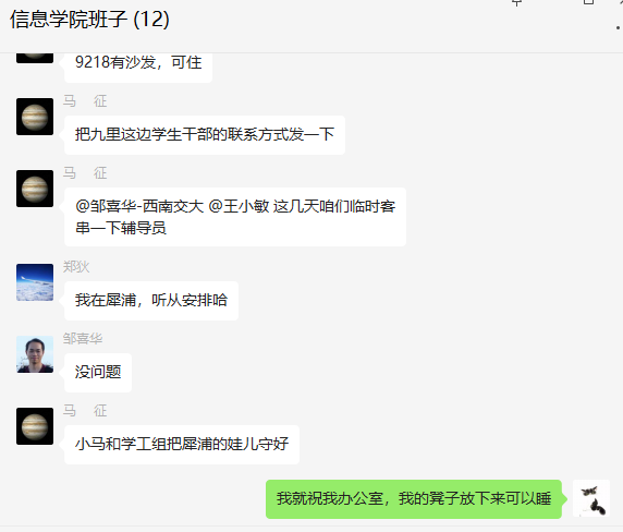 信息学院全体学生在犀浦与九里分别住宿,学院党政班子成员根据辅导员两地工作情况,分别在犀浦与九里就地担任临时辅导员。犀浦校区临时辅导员有院长闫连山、院长助理郑狄,九里校区临时辅导员有党委书记马征、副院长王小敏、邹喜华。对于学生的情况,随时掌握,对于学生的需要与辅导员队伍一道随时关注与解决。
