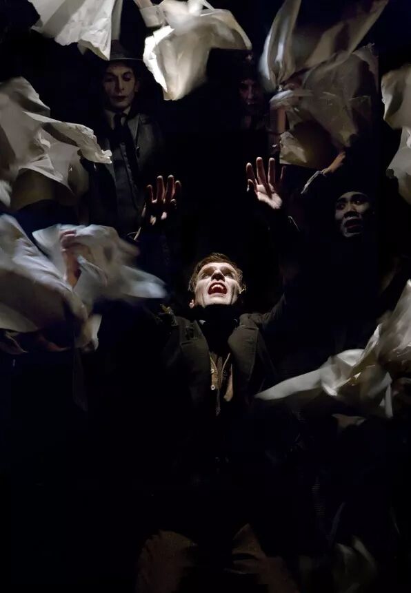 《学院》里有一场戏,像是一个男人的梦境,在舞台后方,很高的地方,只有两个人的剪影,男人站在左边,另外一个身影在右边,他一次次想去抓住那个影子,但是影子一次又一次地向后倒去,坠落……这其实是饰演左边那个男人的演员自己在现实生活中的一种真实感受,父亲的离世给他带来的打击至今都难以消弭,所以他希望在舞台上完成一个仪式,是告别或者让遗憾一次又一次重现,都好。