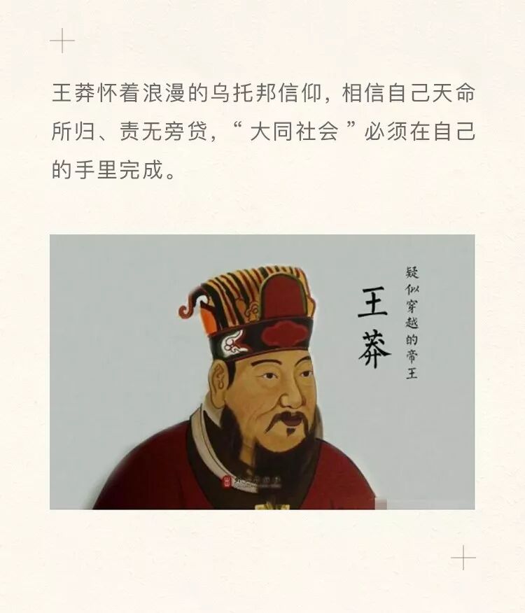 当时改革也有特别的契机:汉朝还在时没人觉得某个王朝应该永远存在。王莽也秉持着这样的信仰,认为社会应有一定的公理和正义。而他的书读得很多,相信自己是天命所归、责无旁贷,“大同社会”必须要在自己的手里完成。