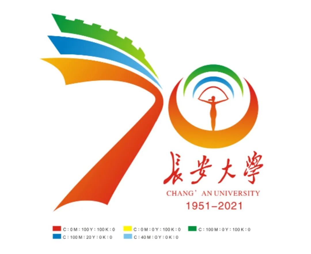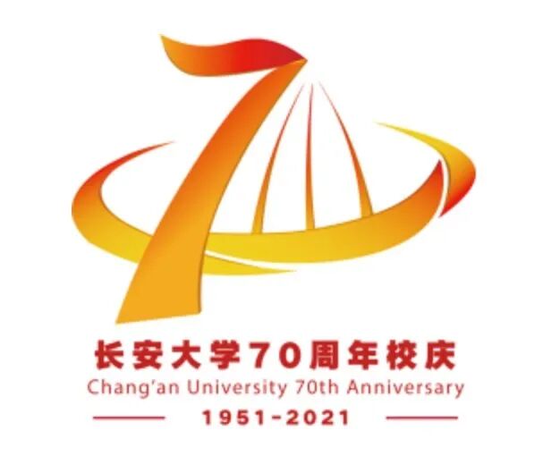 3、长安大学70周年校庆;1951 --- 2021 ;英文(70TH ANNIVERSARY OF CHANG’AN UNIVERSITY)分三行书写,意为三校合一。