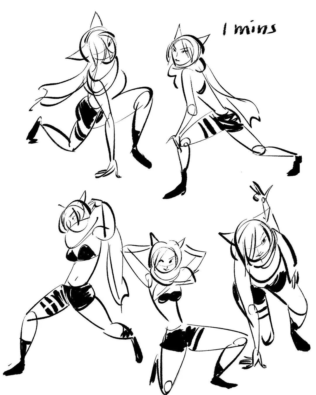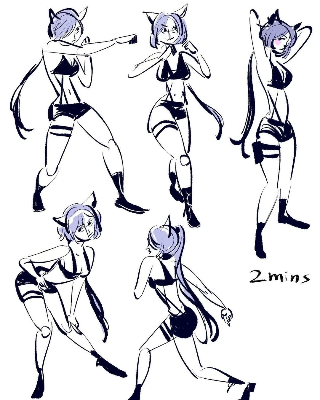 辛颖宗老师日常的角色设计练习,可以看出老师分别以1分钟、2分钟、5分钟和10分钟为时间限制以练习快速绘制人体动态。
