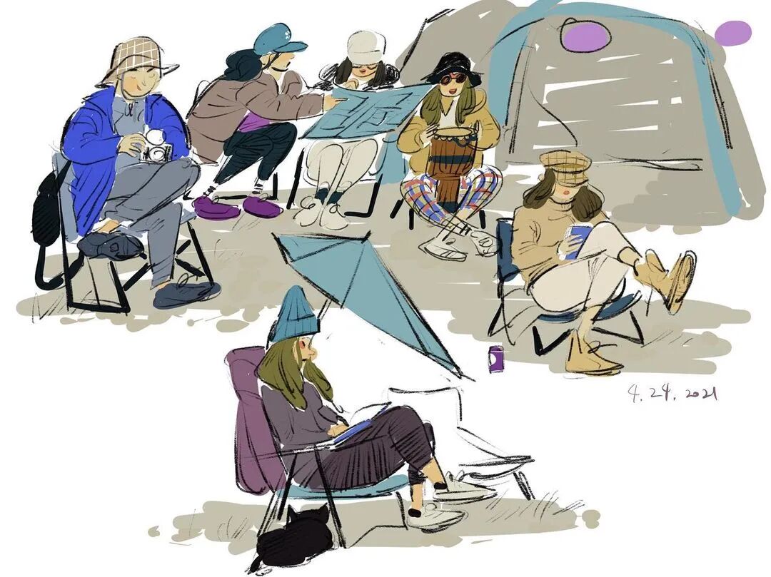 辛颖宗:速写永远是最好的练习⽅法,⽽且很有趣!!我和同事或者是其他爱画画的朋友也会平时约着⼀起出门画速写,有时候去花园、动物园,或者是旧⾦⼭的⼴场上。