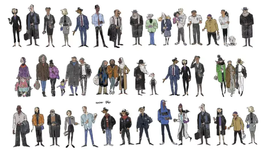 要做到这⼀点,⼀般我的设计思路就是以最快的速度起稿⼀个动态,然后在⼈物的表情和⼩动作上去思考它的个⼈特⾊,探索有没有什么地⽅可以增加它的故事感。在做《心灵奇旅》的过程中,⼏乎所有的⼈类角色都是按照这样的思路去做的。
