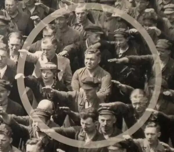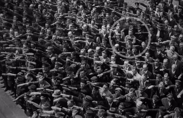 1991 年,一个名为 Irene 的女子,在德国报章「Die Zeit」上找到自己的父亲 August Landmesser,就在上图的方格内。August Landmesser 是谁?他无权无势,只是船厂里的一个工人,却能够在那个时代,那个地方,于纳粹海军训练船 Horst Wessel 出航时,于群众都完全臣服于纳粹淫威之下时,拒绝敬礼。