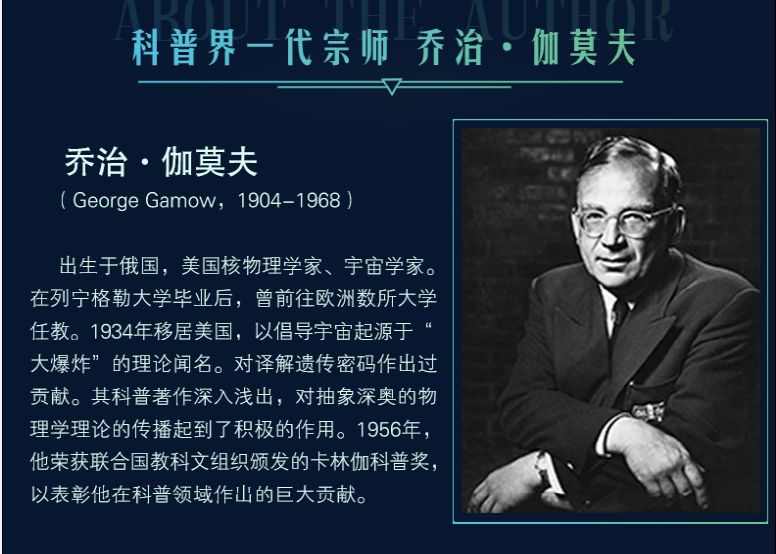 畅销书《数学之美》的作者吴军博士对伽莫夫的著作也非常喜欢,他在接受采访是说:“我在初中时读了《从一到无穷大》,介绍宇宙的科普读物。作者G·伽莫夫是美籍俄裔著名物理学家,他花了很多时间创作科普读物,影响了一代人。”![]()