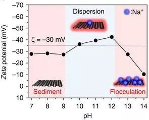 图:制备的石墨烯在不同pH水溶液中的稳定示意图。