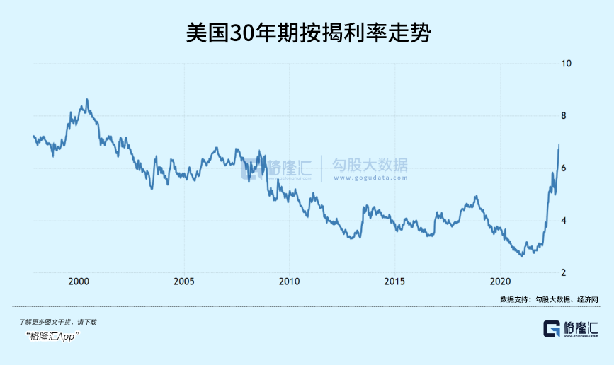 美债利率飙升,美国30年期个人按揭房贷利率也快速飙升。今年10月,该利率已经高达6.94%,创下2002年4月以来最高。这将对美国房地产市场产生明显冲击。
