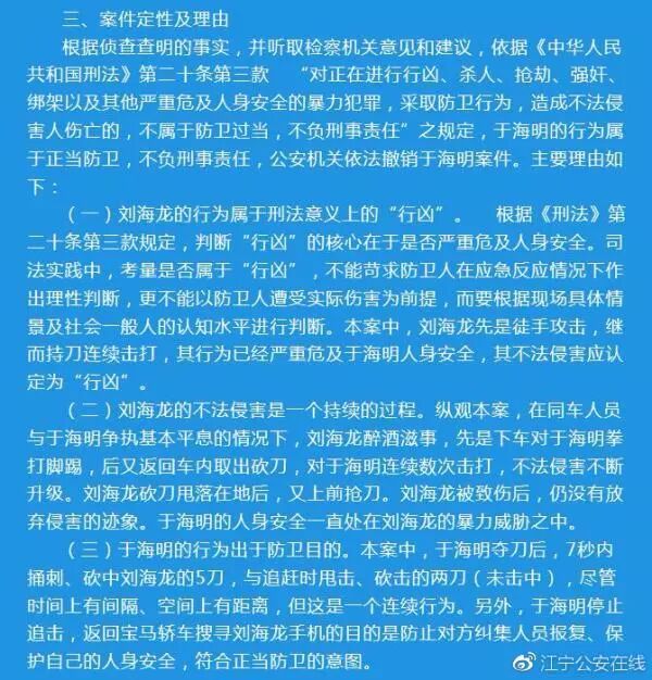 这一段着重从法律角度对事件定性就行了说明。警方首先引用法条对“正当防卫”再次定性,其次就是明确刘海龙的行为是“行凶”无疑,然后重点来了,警方认为“刘海龙的不法侵害是一个持续的过程。”,“刘海龙被致伤后,仍没有放弃侵害的迹象。于海明的人身安全一直处在刘海龙的暴力威胁之中。”这两段堪称是本案定性为正当防卫的核心。最后,警方认为于海明的(所谓反杀)行为出于防卫目的。无论是直接刺中砍中刘海龙的5刀,还是后续追砍没砍到的2刀,都是一个连续行为。