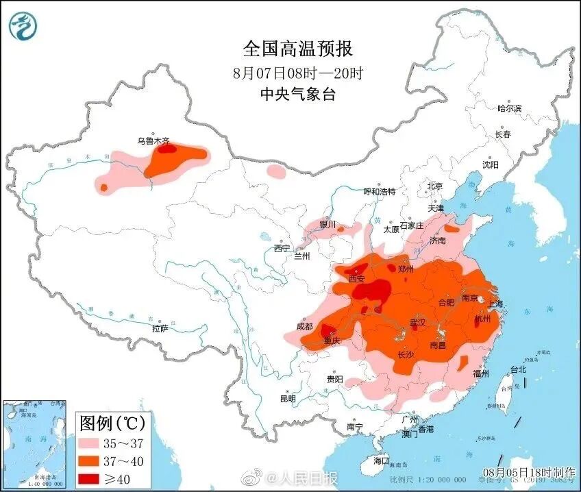 大部最高气温38到40℃,局地40℃以上