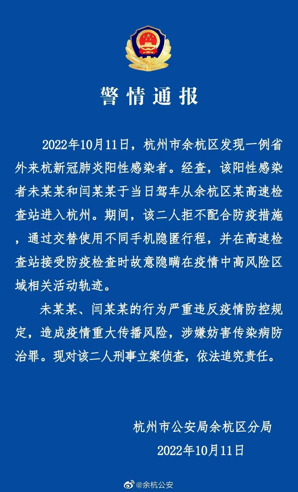 昨天(10月11日)深夜,杭州市公安局余杭分局发布警情通报:10月11日,杭州市余杭区发现一例省外来杭新冠肺炎阳性感染者。经查,该阳性感染者未某某和闫某某于当日驾车从余杭区某高速检查站进入杭州。期间,该二人拒不配合防疫措施,通过交替使用不同手机隐匿行程,并在高速检查站接受防疫检查时故意隐瞒在疫情中高风险区域相关活动轨迹。未某某、闫某某的行为严重违反疫情防控规定,造成疫情重大传播风险,涉嫌妨害传染病防治罪。现对该二人刑事立案侦查,依法追究责任。
