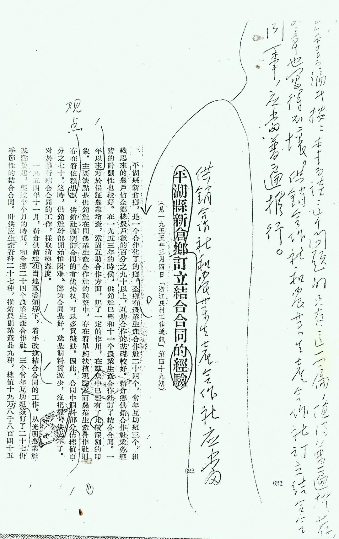 “本书谈这个问题的只有这一篇,值得普遍推荐,文章也写得不坏。供销合作社和农业生产合作社订立结合合同一事,应当普遍推行。”