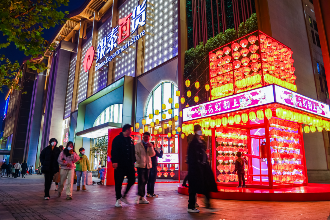 天色渐黑,杭州武林银泰门店前的花灯又亮了起来,吸引不少人驻足。刚刚过去的元旦小长假,赏花灯、敲钟祈福活动,让这里成了网红打卡点。