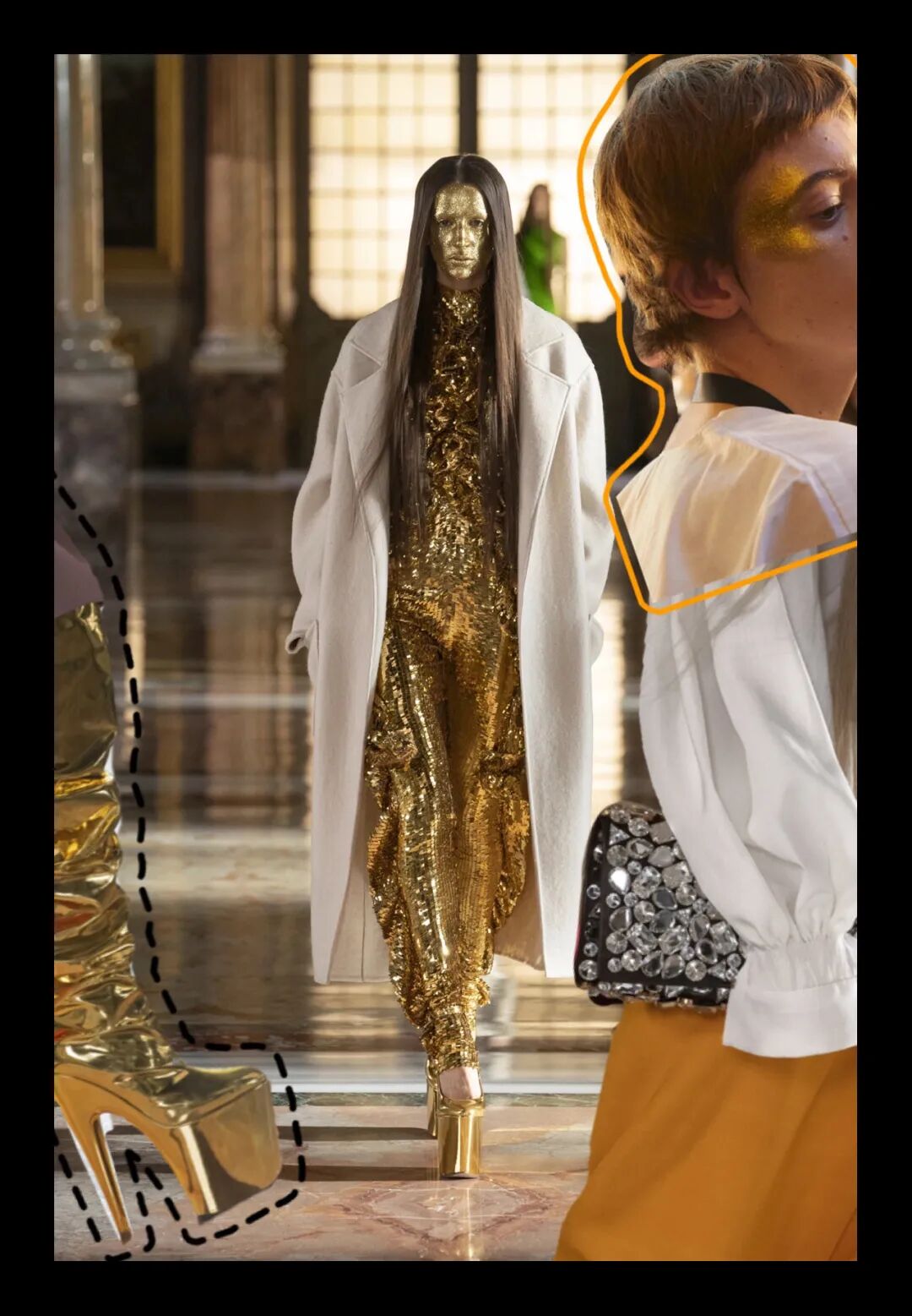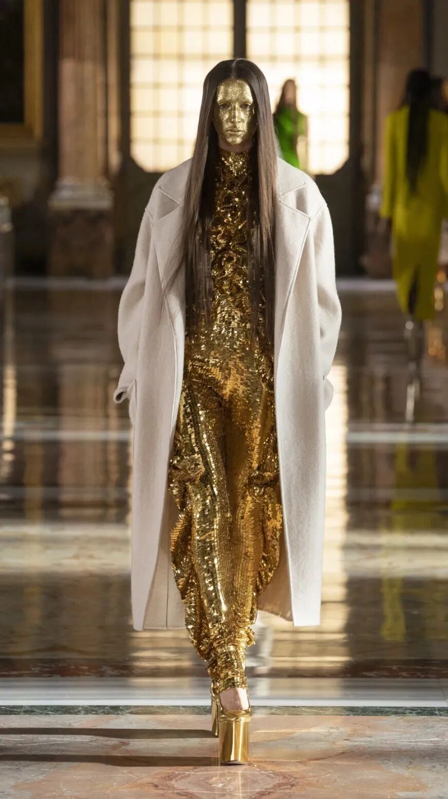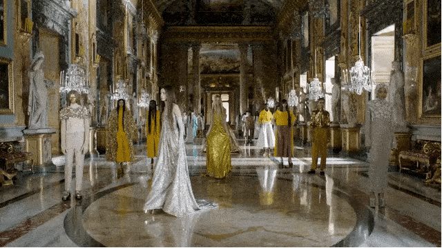 秀场选了在了罗马科隆纳宫诶的萨拉格兰德,这是一座历史可追随到14世纪的巴洛克式建筑。里面富丽堂皇、庄严肃穆,将服装上的金色元素承托的更为凸出,同时也能展现出高调华贵的戏剧效果。