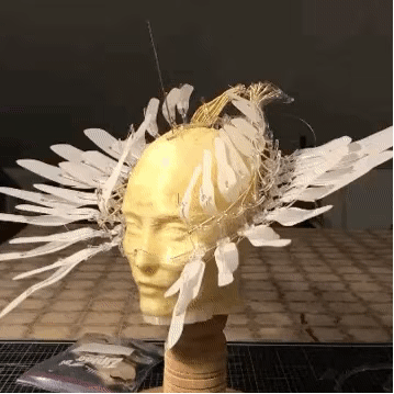 皇冠由透明的丝线穿过18个黄铜线圈连成,冠顶的每根羽毛笔会随着风律自由摆动,形成一道S行的运动轨迹,就像佩戴者正在思考引发了皇冠的动荡,是不是有种科幻电影既视感呢?