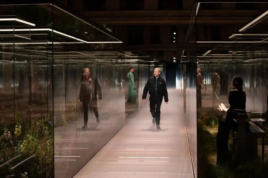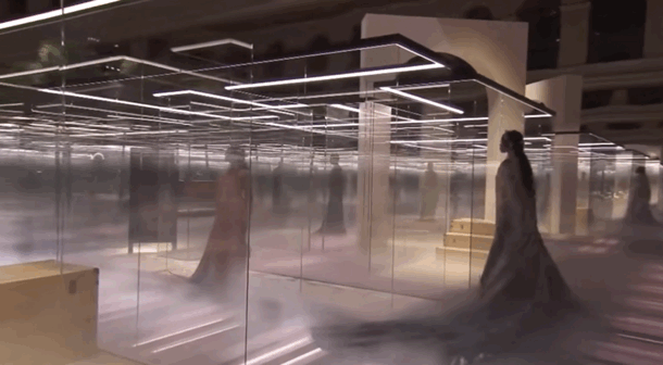 秀场选择在巴黎证劵交易所,里面被打造成大型玻璃迷宫,FF形logo的玻璃橱窗,还有与伦敦稀有书商Peter Harrington Rare Books合作的图书陈列、珍藏图书手稿展览,都在暗地里紧扣主题。