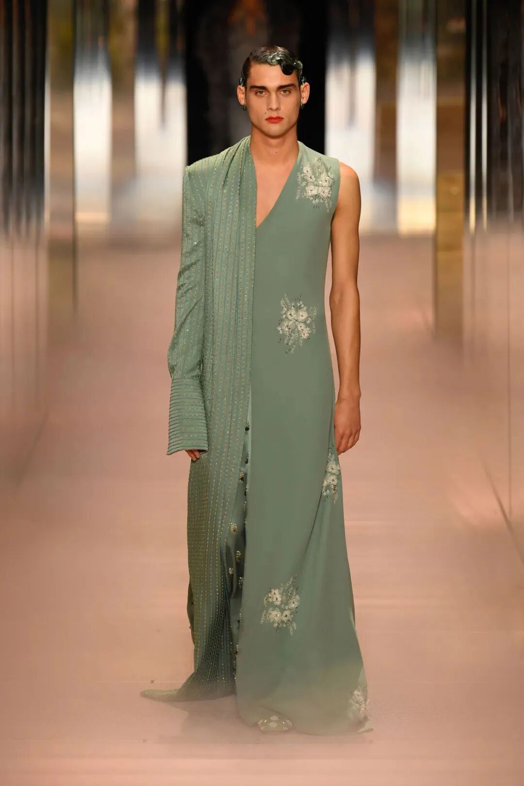 所以这一季,他让男装也登上高定的舞台,通过众多一衣两性穿的LOOK,呼应出同一件衣服,是可以为女人设计的,也能是为男人设计的。