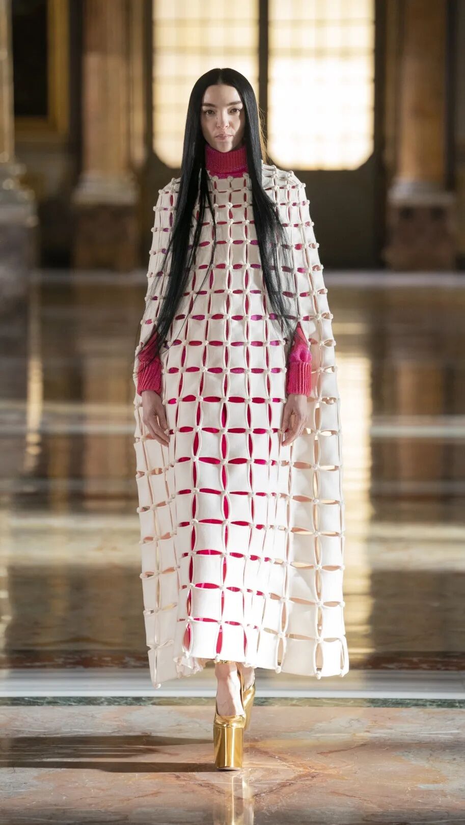 比如开场Mariacarla Bosono身着的这件象牙白镂空斗篷,将2000多米的面料,被剪裁成500个方块拼接在一起。看似简约的设计实则要花费3000个小时才能完成!
