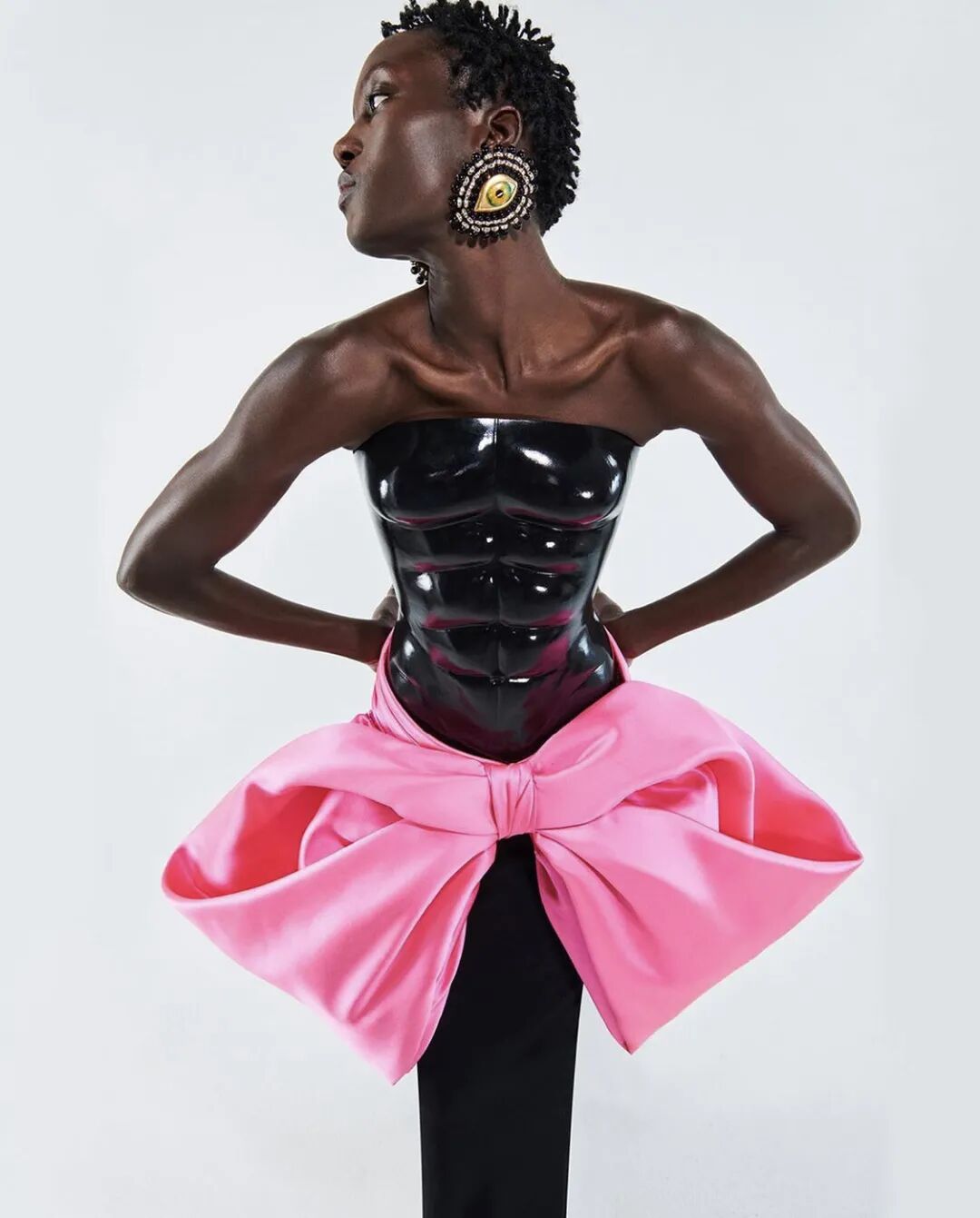 如果要用“窒息”来形容美的极致,那这次的Schiaparelli便是更高一级的「美到抓狂」!肌肉礼服、金属面具和马甲、鸭头露胸礼服、超长的金属甲套......这些怪诞又美丽的超现实主义设计,充斥着各种天马星空的奇思妙想,让人惊叹出一句: