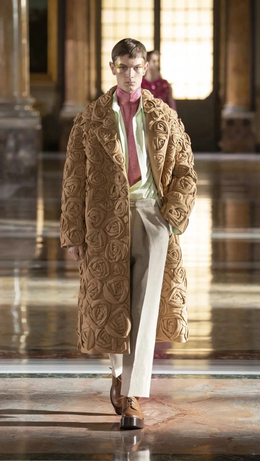 又比如Look 11,男模 Mark Visee身上这件玫瑰花羊绒大衣,采用了“雕琢”的手法,将每一朵玫瑰花编织出来。光是全身的250朵玫瑰花,就用了280米的羊绒面料。