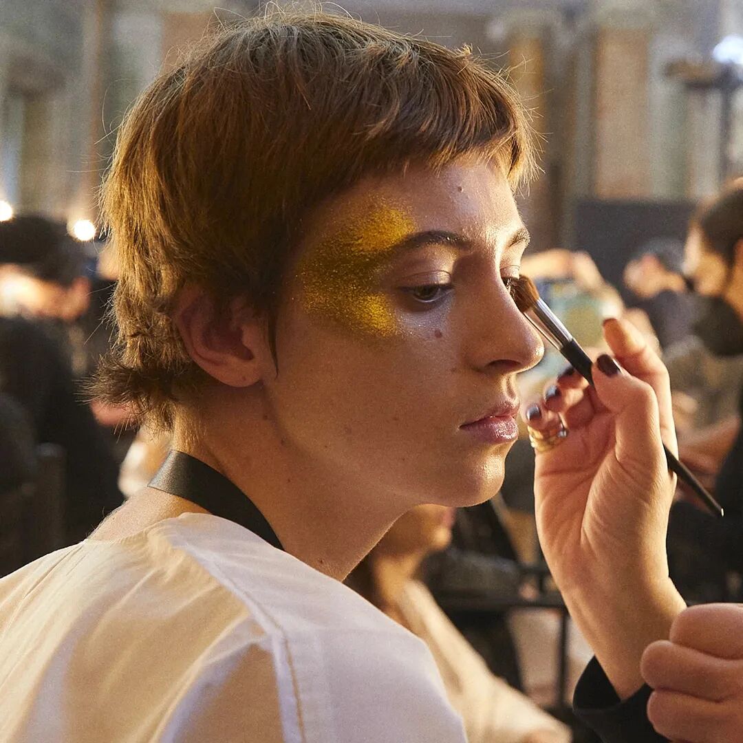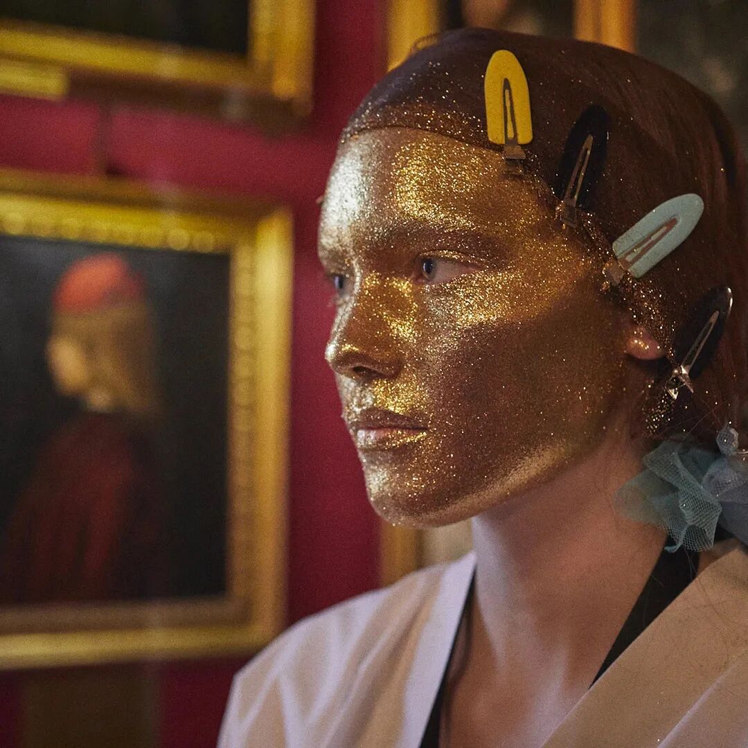 妆发也是引人入胜,将金粉元素大量运用,搭配模特金发,更强调了戏剧感和华丽美学的磅礴气势。