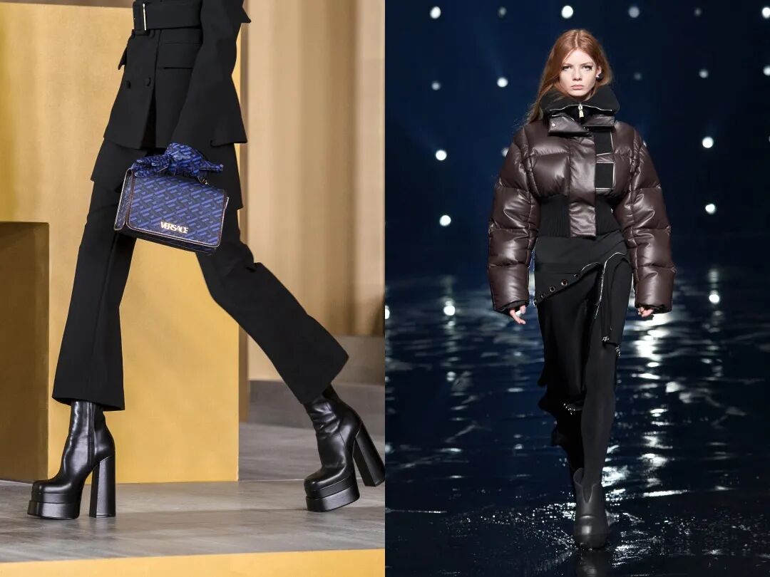 其中靴子的性价比最高,可以在夏末初秋就选择购入,高度在膝下即可具体要参考你计划哪种搭配方法。如若收紧阔腿建议可以选择高筒,搭配裙装则长到脚踝就可以