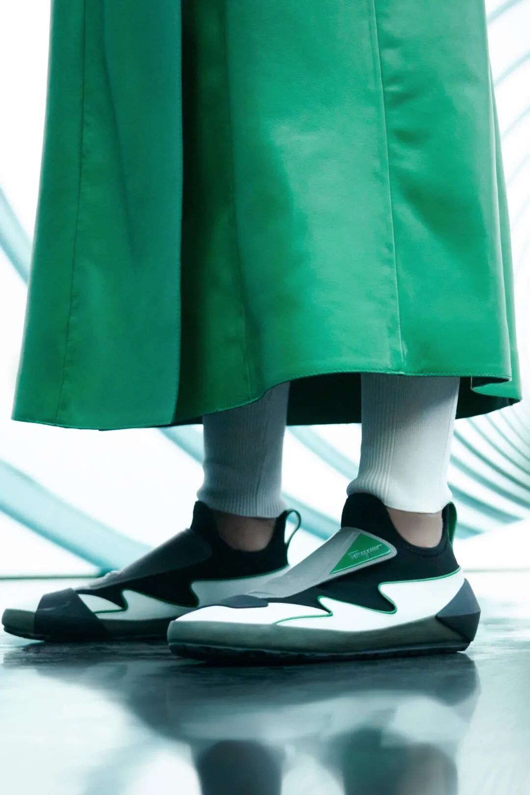 最后一段则是科幻的登月部分,这组是以黑色元素搭配荧光色的压轴系列,大面积的荧光色系运用在黑色布景下十分出挑,凸显这一季夸张轮廓的版型。